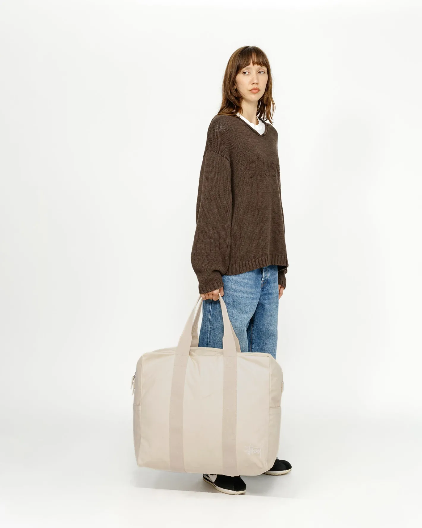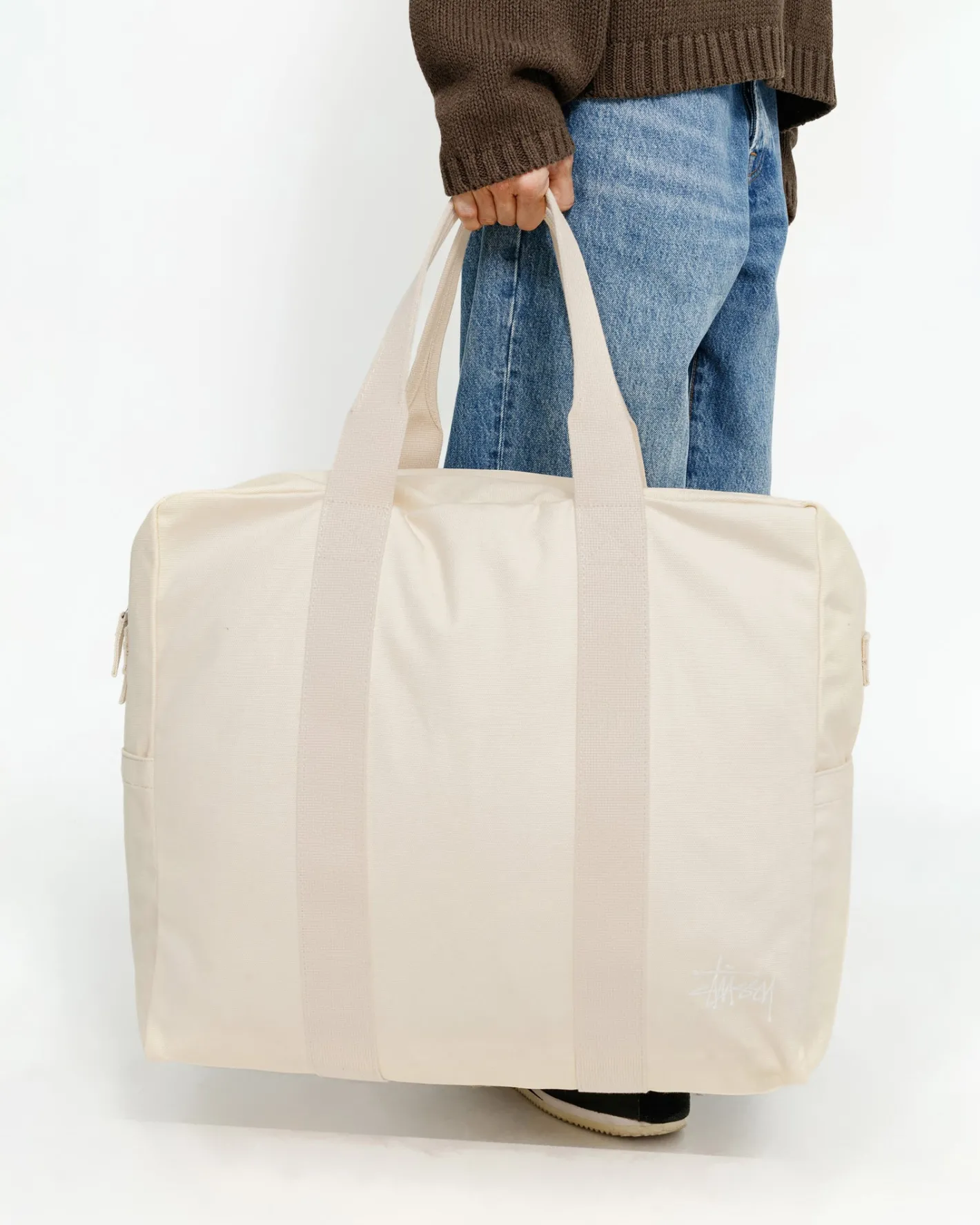 Military-inspired flight bag in cotton canvas. Features a large central zipped compartment with an interior drop pocket, and exterior side pockets. Stüssy basic stock logo embroidered at one side.